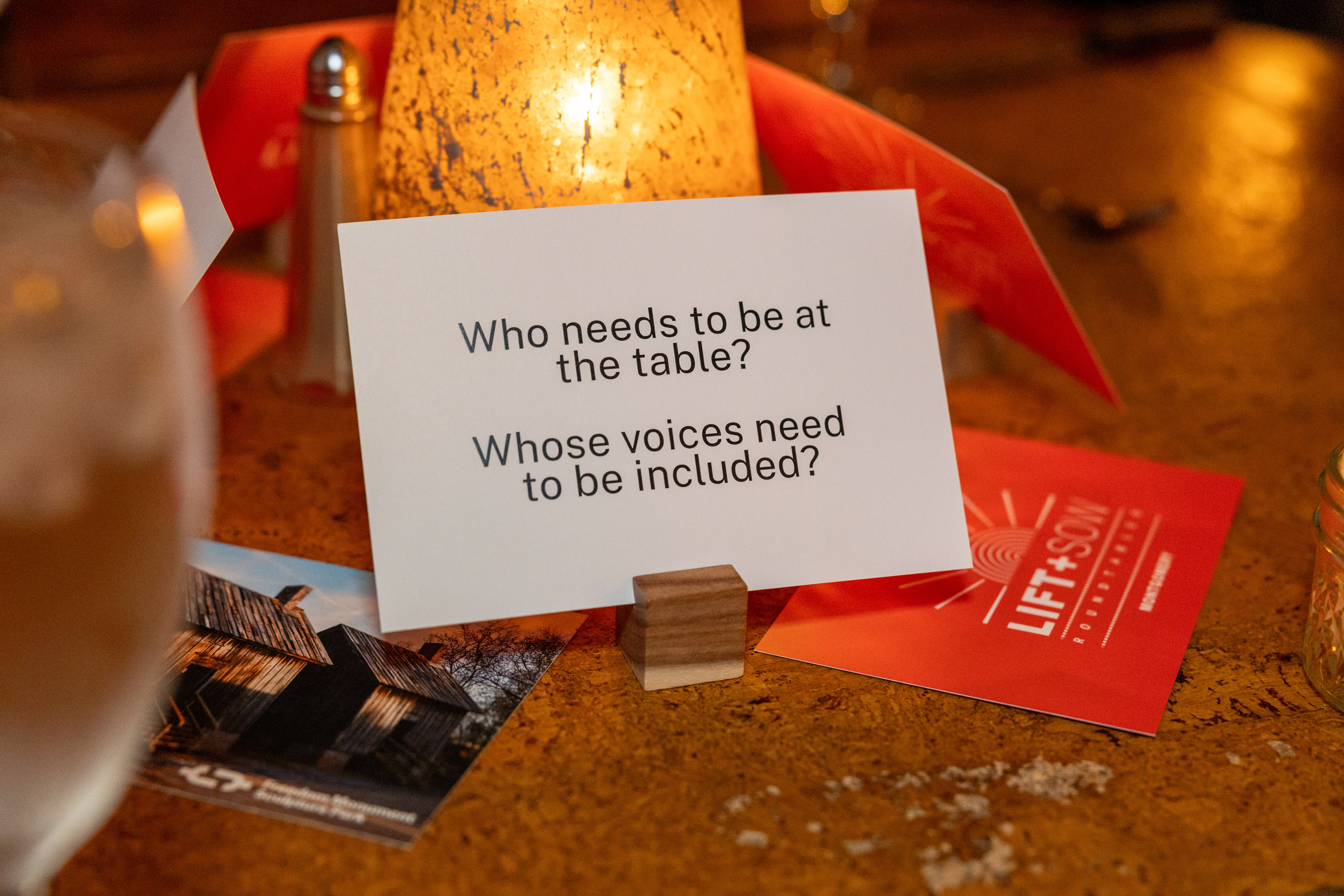 Photo of a tablecard reading, "Who needs to be at the table? Whose voices need to be included?"