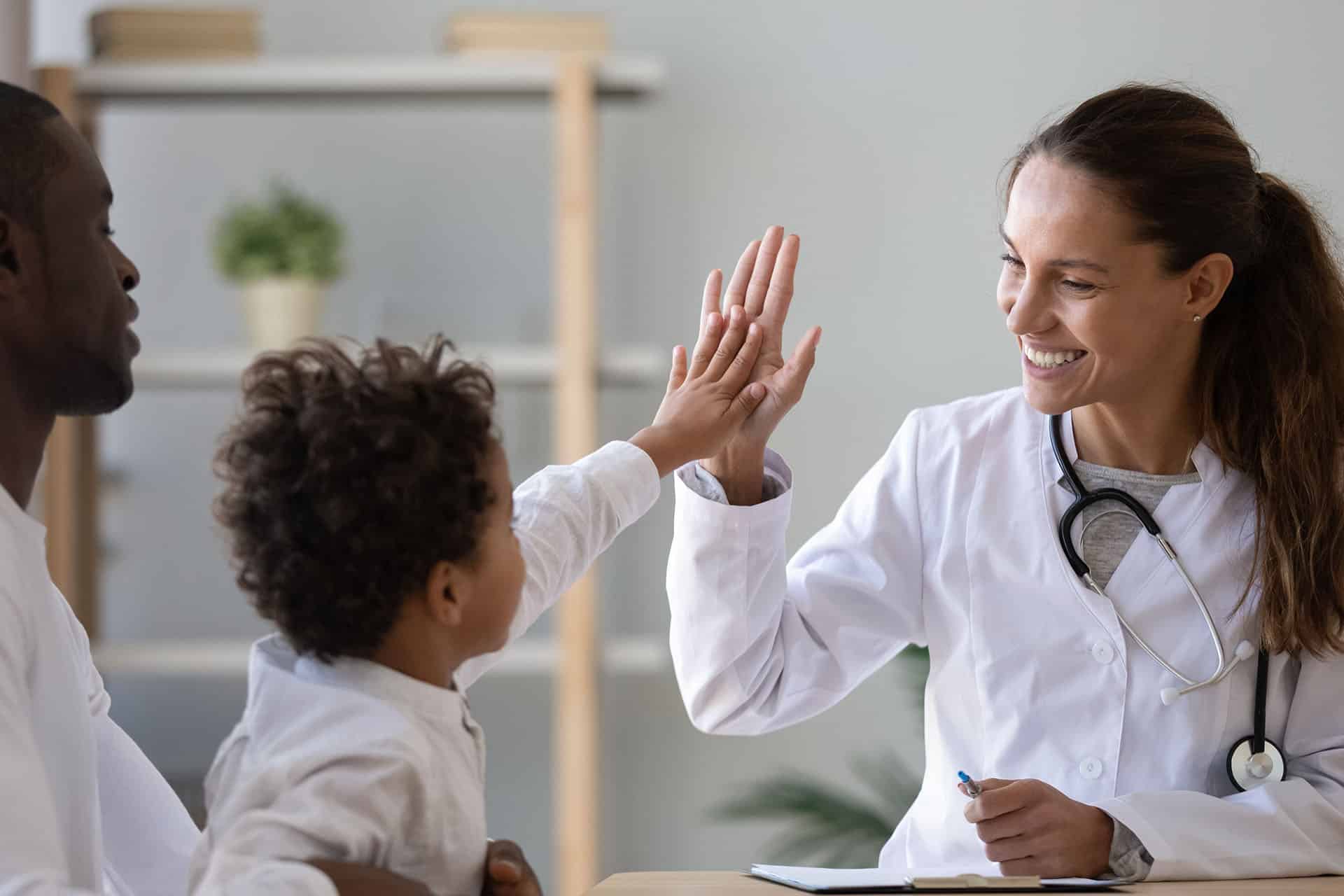 Smiling Female Doctor Give High Five to Young Patient A primary care physician providing healthcare to her young patient.