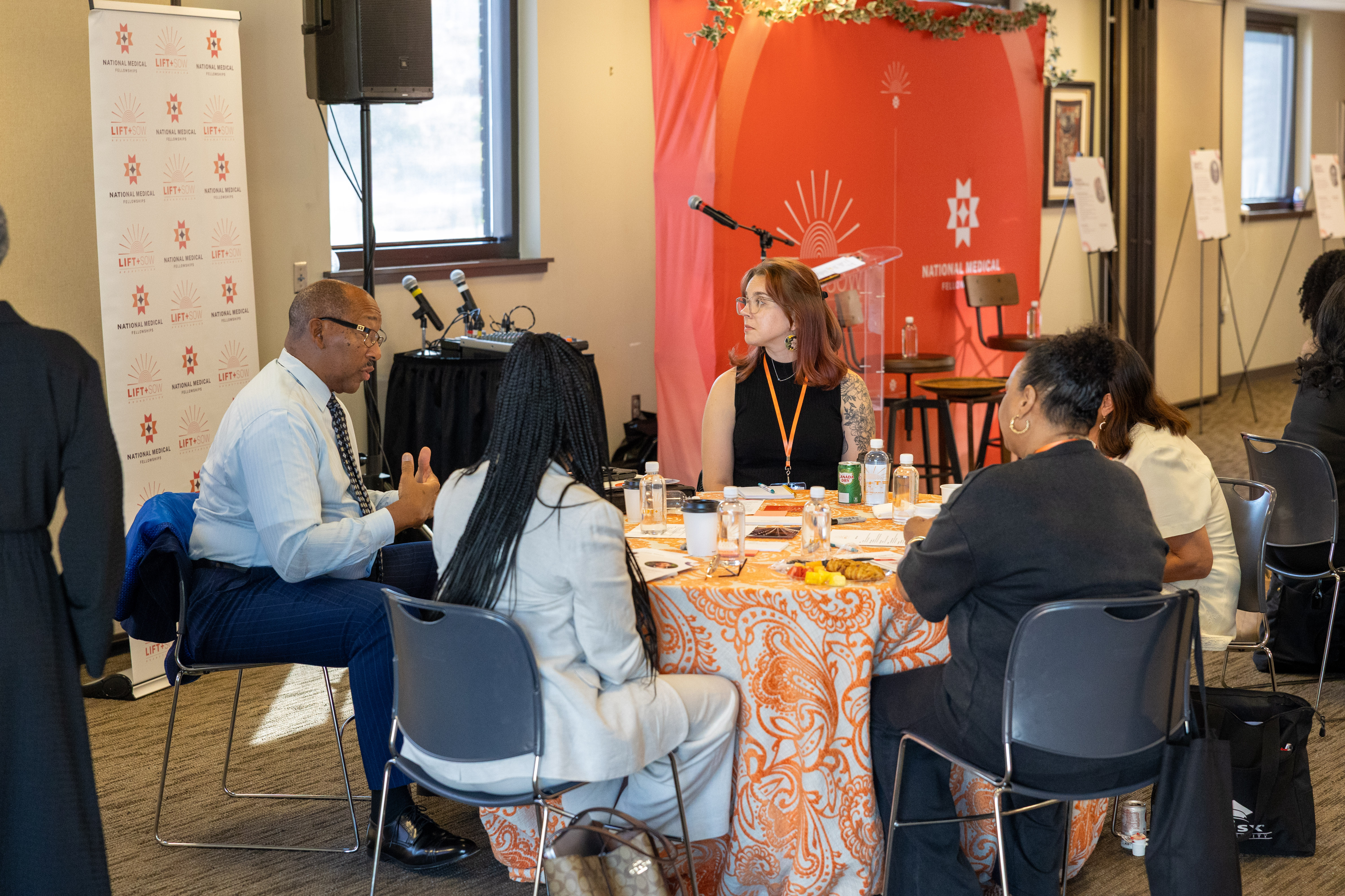 Roundtable participants are seated at a round table and listening to a man at the table speak and gesture.