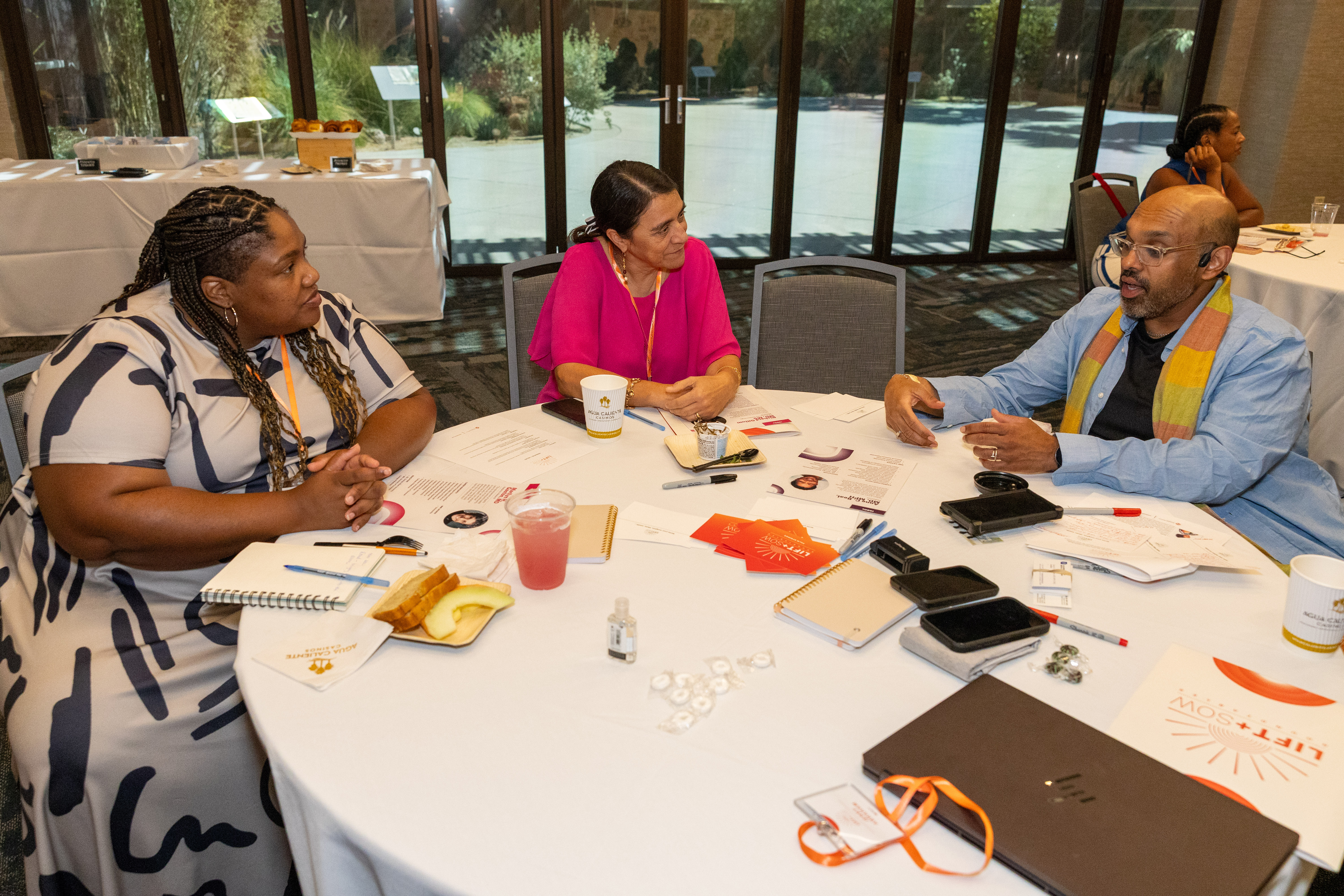 Three people are sitting at a round table having a discussion