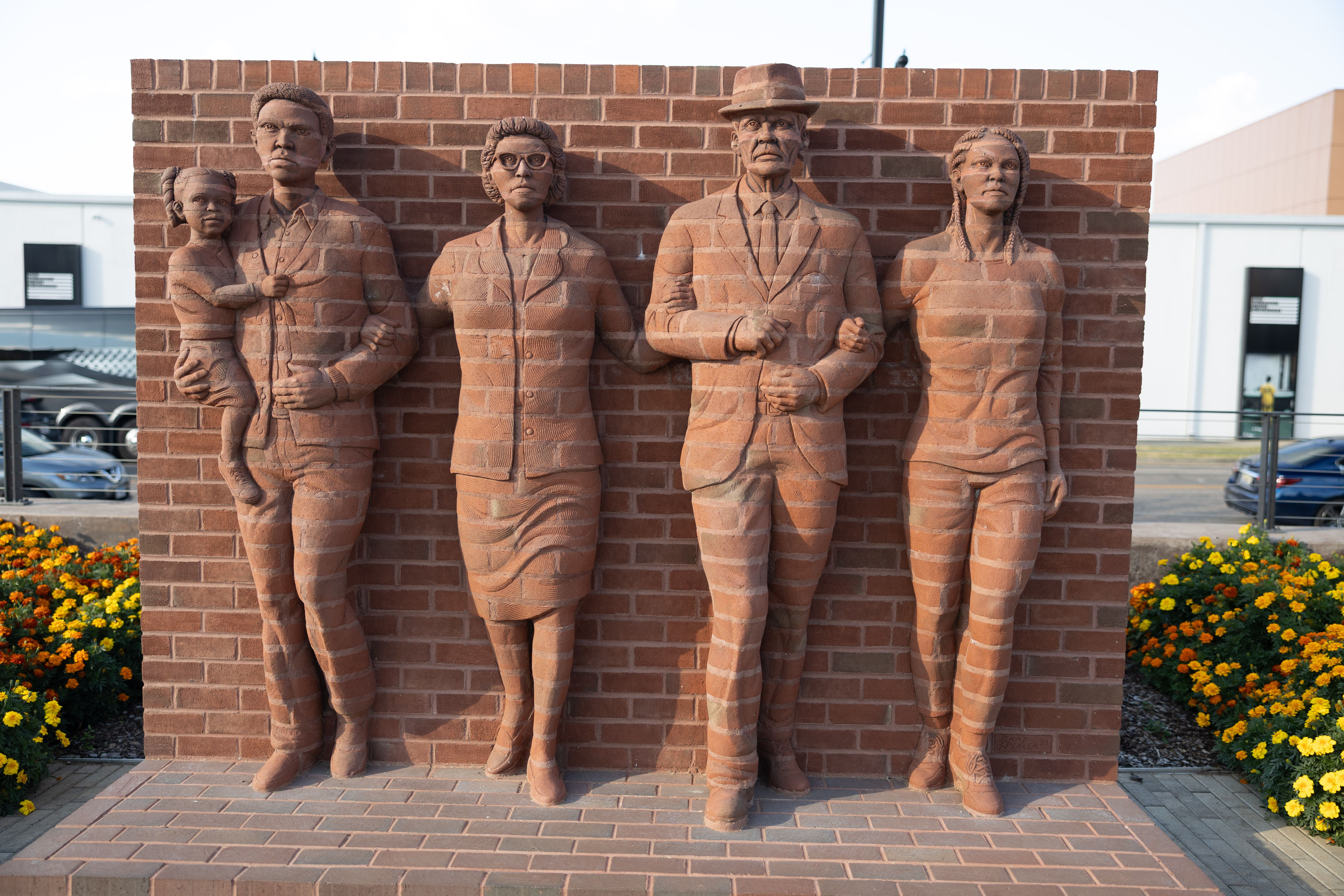 A brick sculpture of four leaders of the civil rights movement, two women, and two men, with one of the men holding a small child.