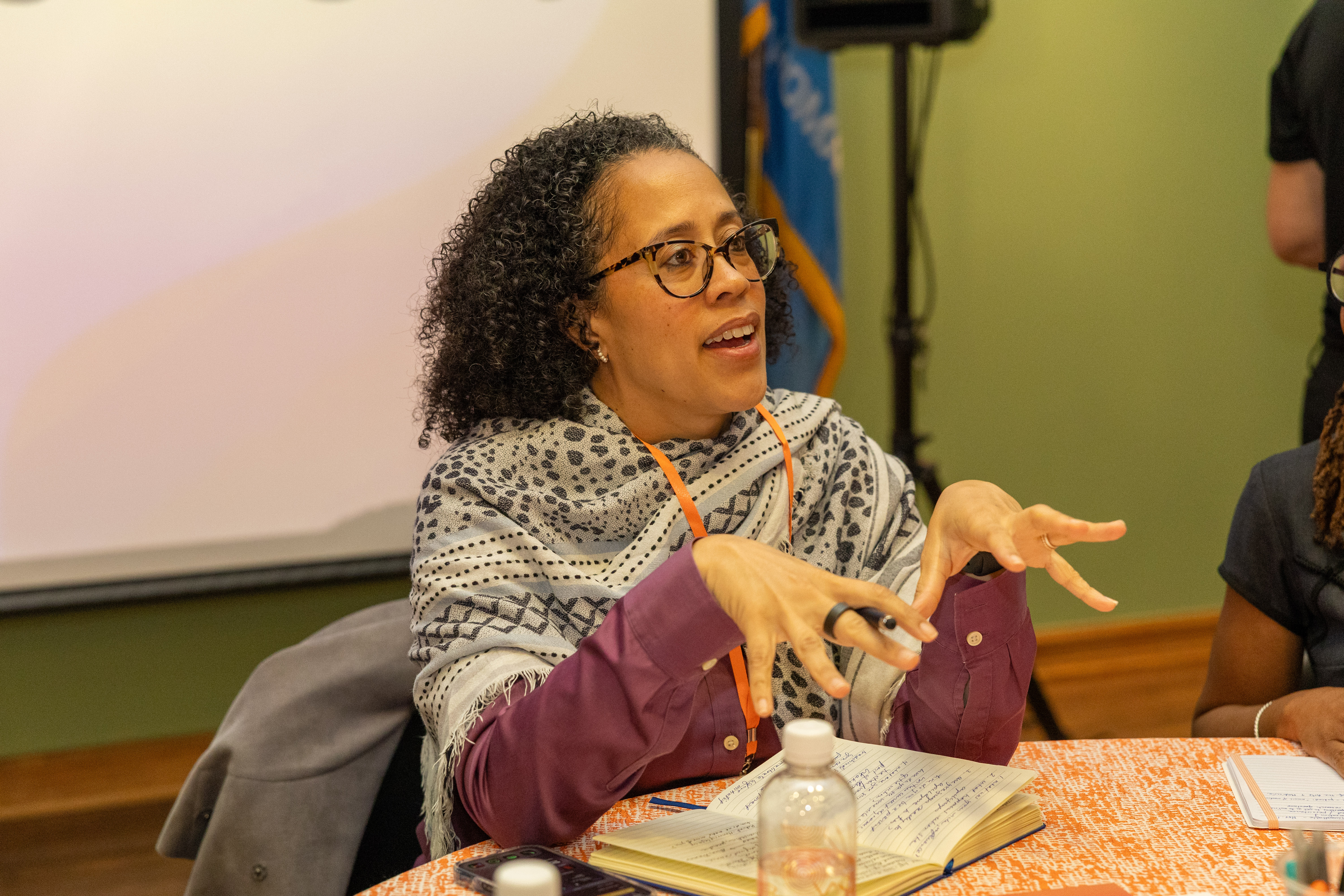 A woman wearing a gray shawl and glasses speaks while seated at a table and is gesturing with her hands