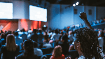 Photo of an audience in an auditorium with two large screens on the stage